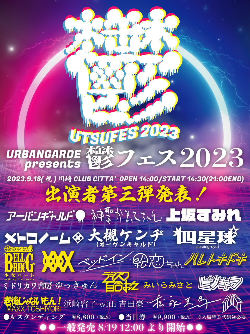 出演:アーバンギャルド / 上坂すみれ / 大槻ケンヂ(オーケンギャルド)/ メトロノーム / 絵恋ちゃん / ベッド・イン / ミドリカワ書房 / 神聖かまってちゃん / 四星球 / ゆっきゅん / ピノキヲ / 浜崎容子with 吉田豪 / 松永天馬 / 肋骨(マリアンヌ東雲 from キノコホテル×おおくぼけい from アーバンギャルド×ALi))/ BELLRING少女ハート / キスエク / ハレトキドキ / みいらみさと / ディスク百合おん / 老後じゃないもん!MAXX TOSHIYORI